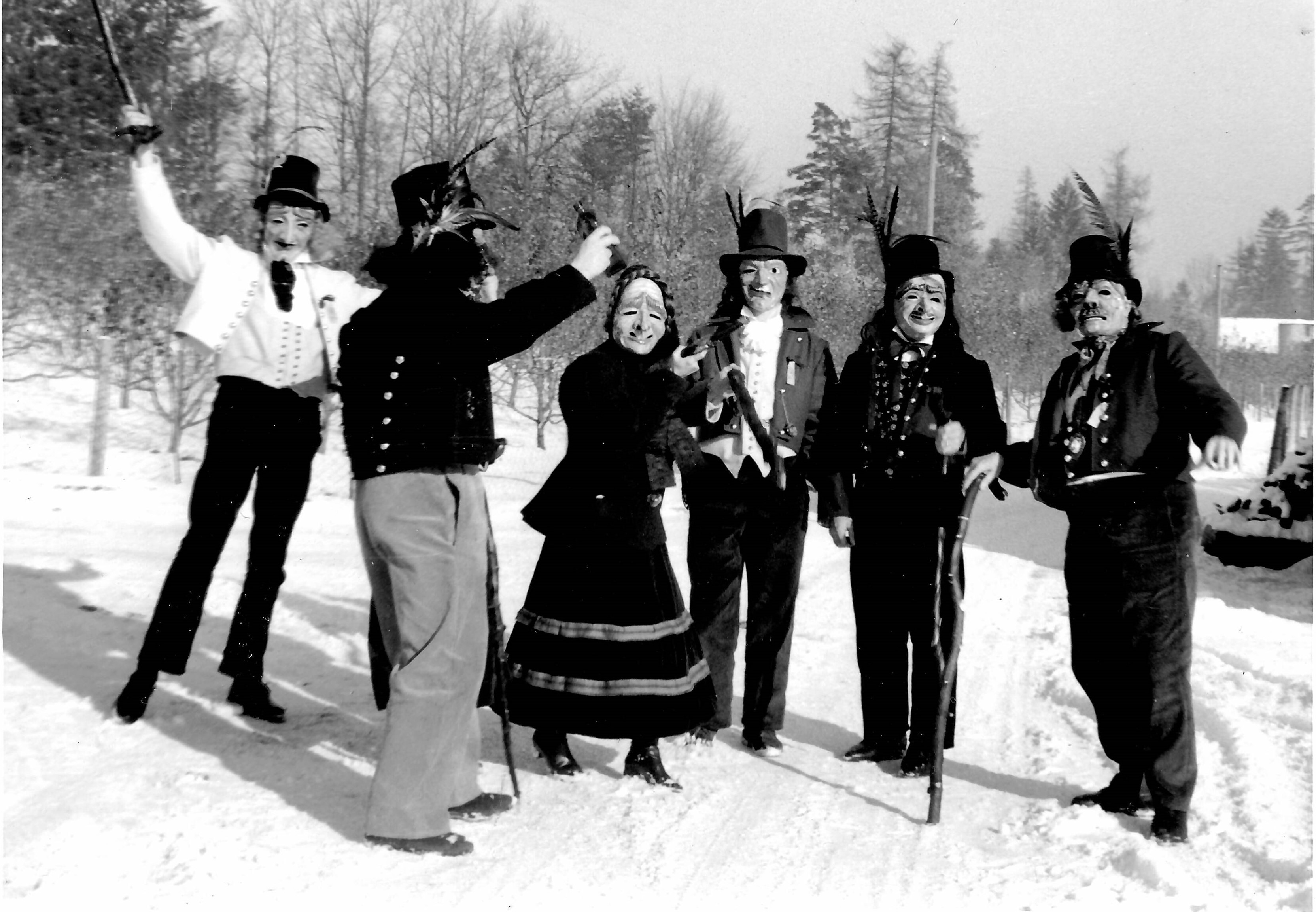 Aber im Januar 2021 jährte sich die 1. Maskenvorstellung zum 50. Male. Dieses Bild entstand im Schwedistobel bei Sepp Roth anlässlich der Vorführung unserer Räubermasken (im Vordergrund mit erhobener Hand unser Ehrenzunftmeister Otto Lutz). Das waren noch Zeiten ...