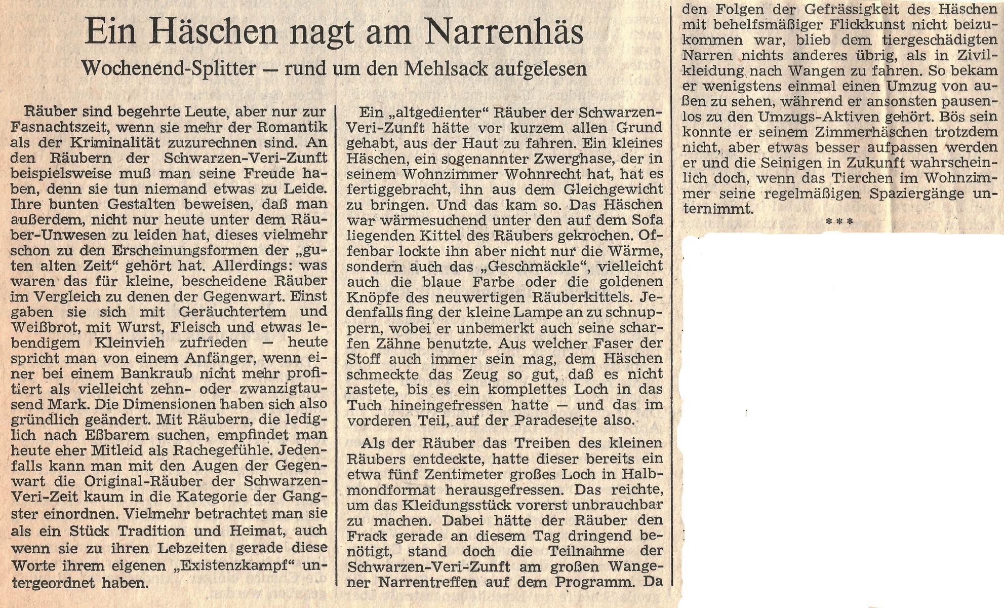 Wir hoffen, Eure Häser sind für die nahende Fasnet tadellos in Schuss? Nicht dass es Euch so ergeht, wie einem unserer Zunftmitglieder anno 1975 ... aber lest selbst.