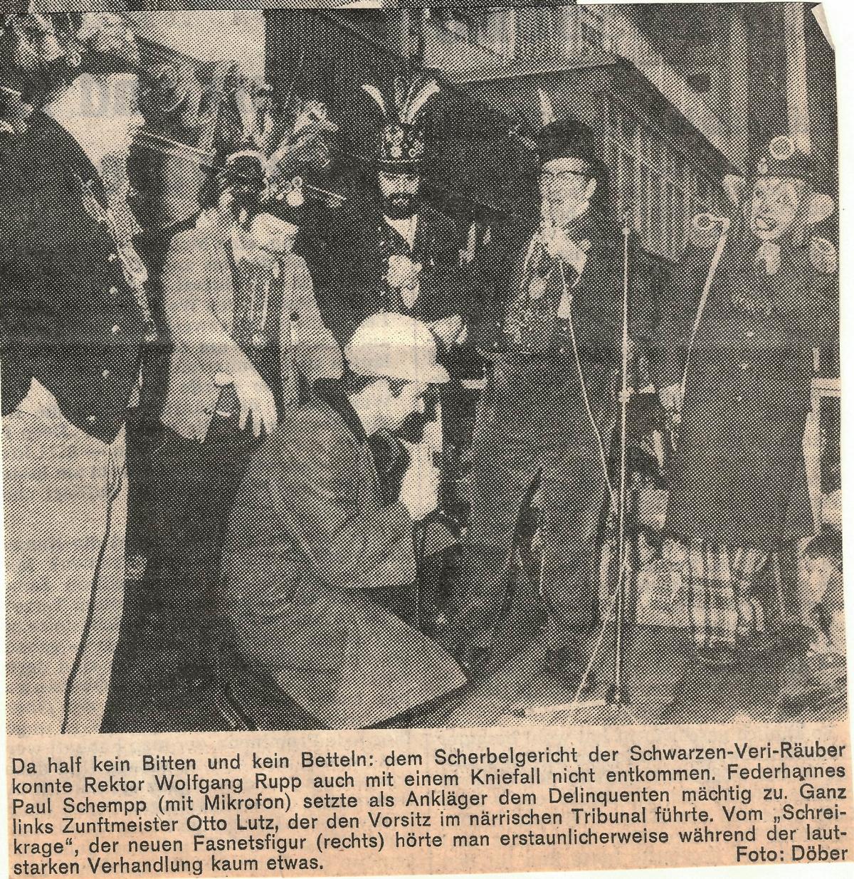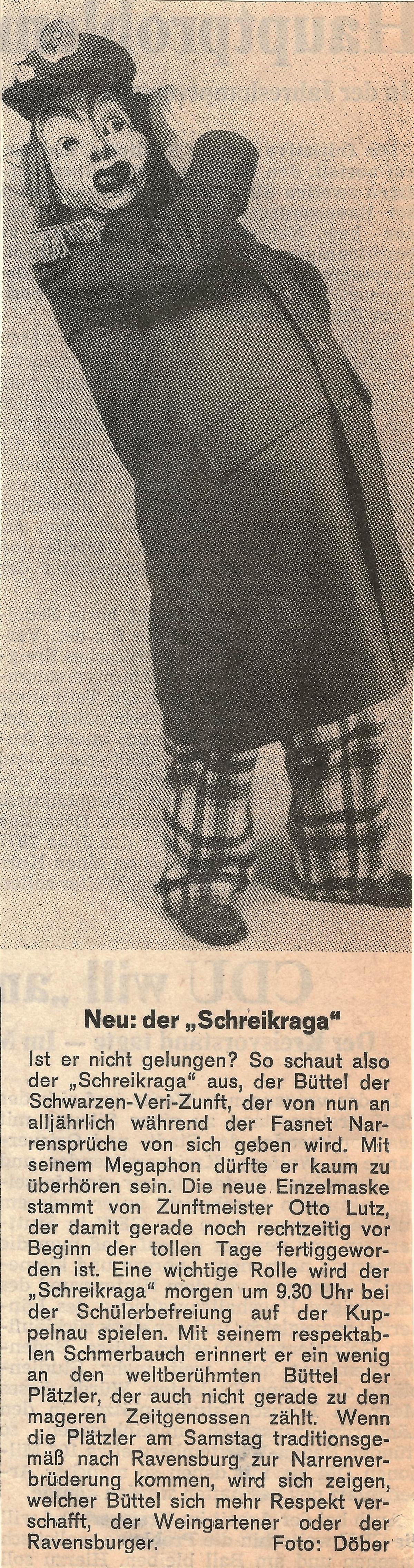 Und so trat zur Fasnet 1977 unser Schreikraga in Erscheinung, um auf die Kinder, die am Umzug teilnahmen aufzupassen. Meist wurde er von unserem Ravensburger Original dem "Kasperle Maier" begleitet. Die erste Maske hat eine große Mundöffnung, damit ein Megaphon hineinpasste. Trotzdem gab sich der Schreikraga an seinem Premieren-Auftritt erstaunlich wortkarg ...