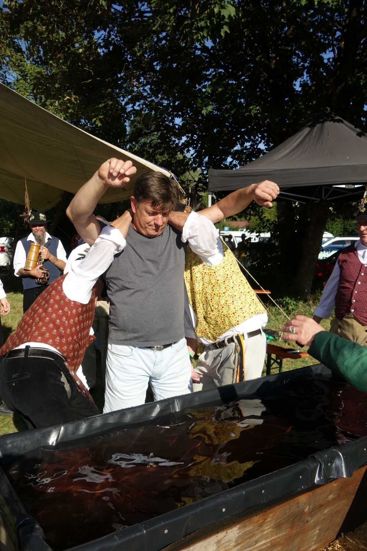 Zum Klang unserer Schwarze-Veri-Schalmeien und nach der Begrüßung unseres Zunftmeisters Jürgen Breg und Maskenmeister Markus Kraus wurden alsbald alle Neumitglieder von den Räubern eingefangen und sogleich vom Henker zur "Richtstätte" (in diesem Fall das Taufbecken) geführt. Nach der Präperation und dem Abschmecken des Taufwassers mit der berüchtigten "Schwiegermuttermilch" wurde unter der Anfeuerung der anwesenden Gäste von den Räubern gehoben, gelupft, versenkt, gewaschen, getrocknet, gestempelt, getränkt und in den Reihen der Zunft aufgenommen. Ab und an muss sogar noch "notgetauft" werden ... was unsere neue Hexenführung erfahren durfte. Ab und an reicht halt eine Taufe nicht ...