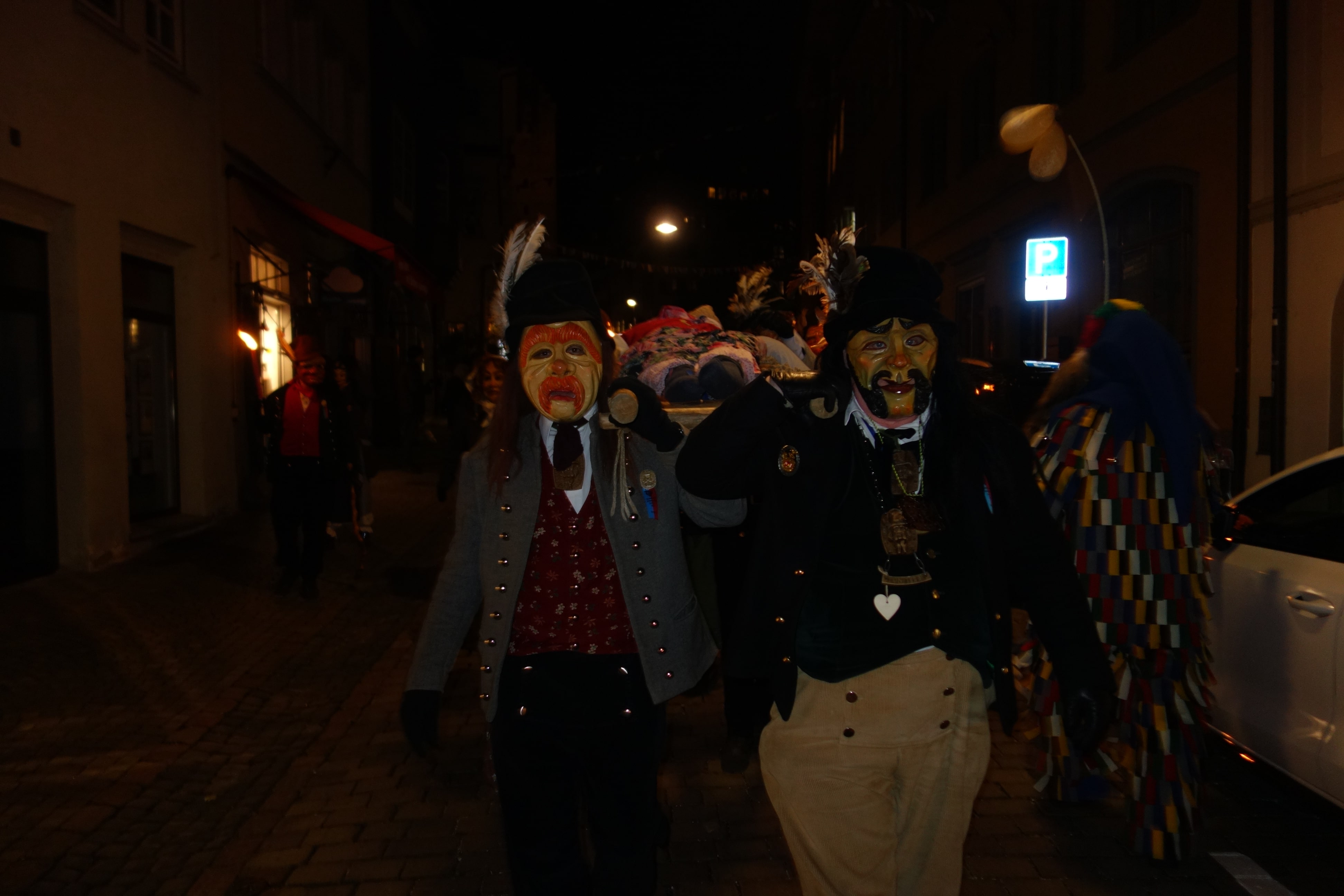 Und so ging die "alte" Fasnet dahin ... den Weg alles Irdischen. Getragen von den Räubern wurde sie auf ihrem letzten Gang von vielen Zuschauern, Zunftmitgliedern und Vertretern der Stadt begleitet. Alle Reanimationsversuche scheiterten, nichts, aber auch gar nichts wollte ihr nochmals den Odem des Lebens einhauchen.