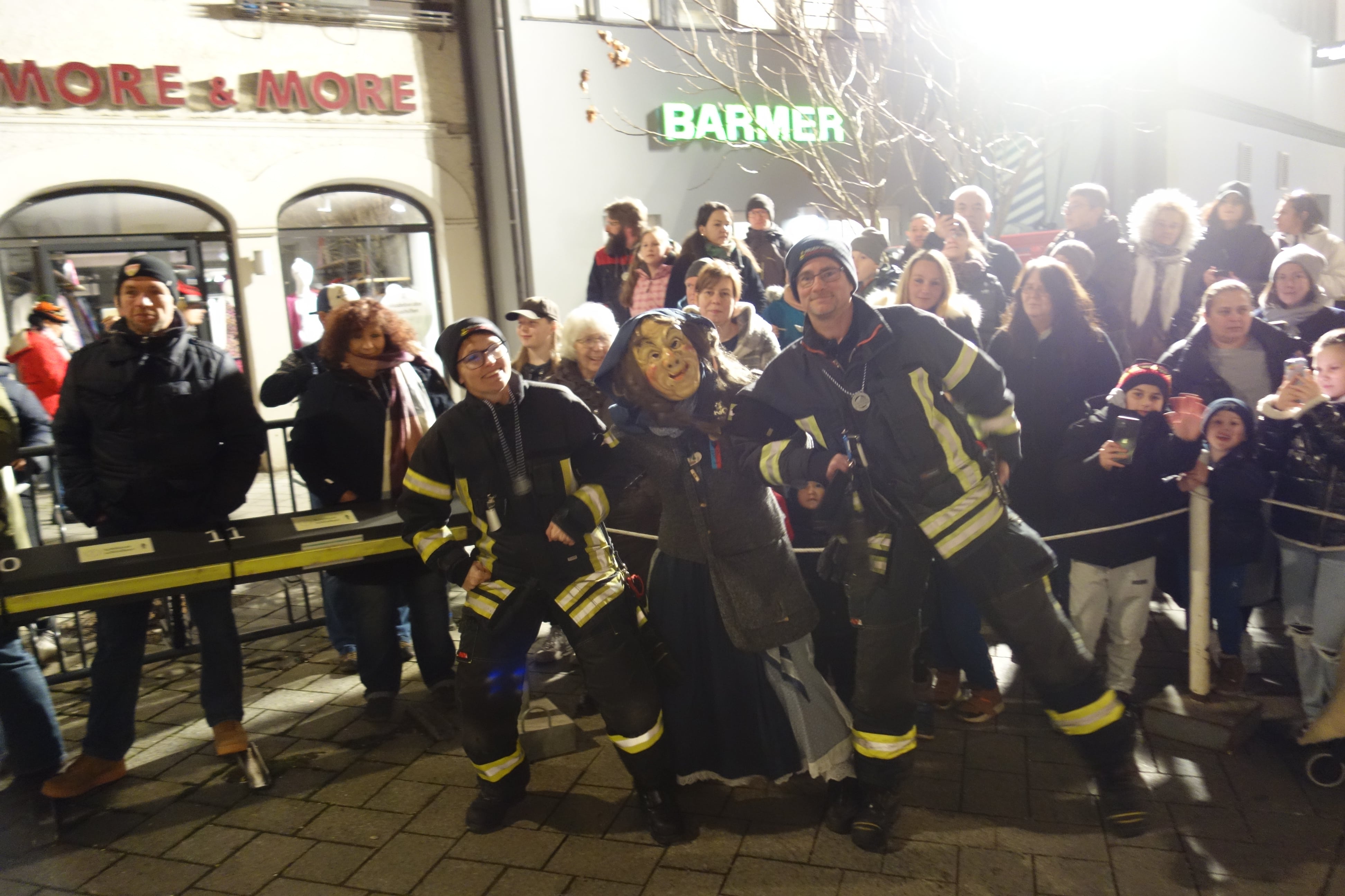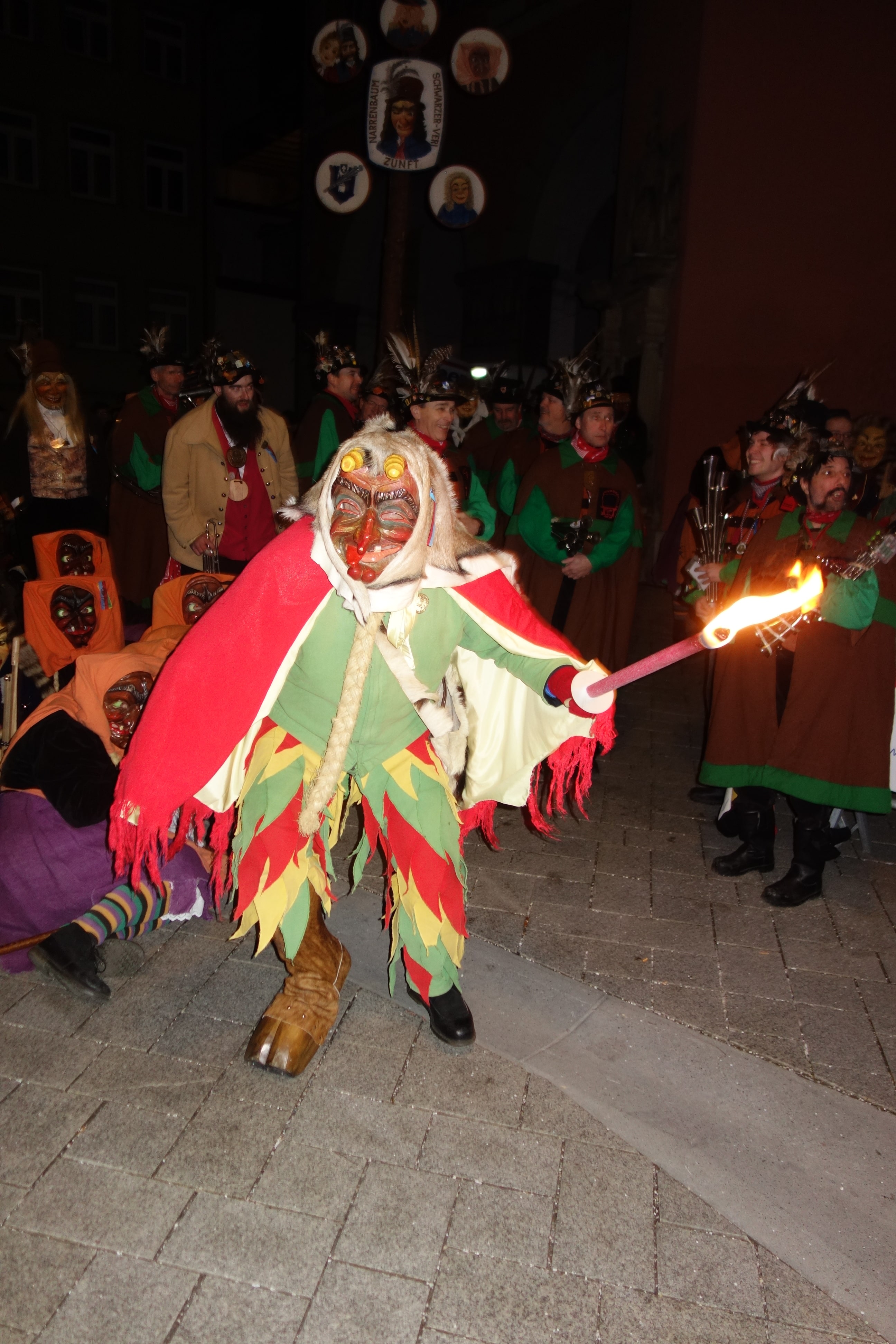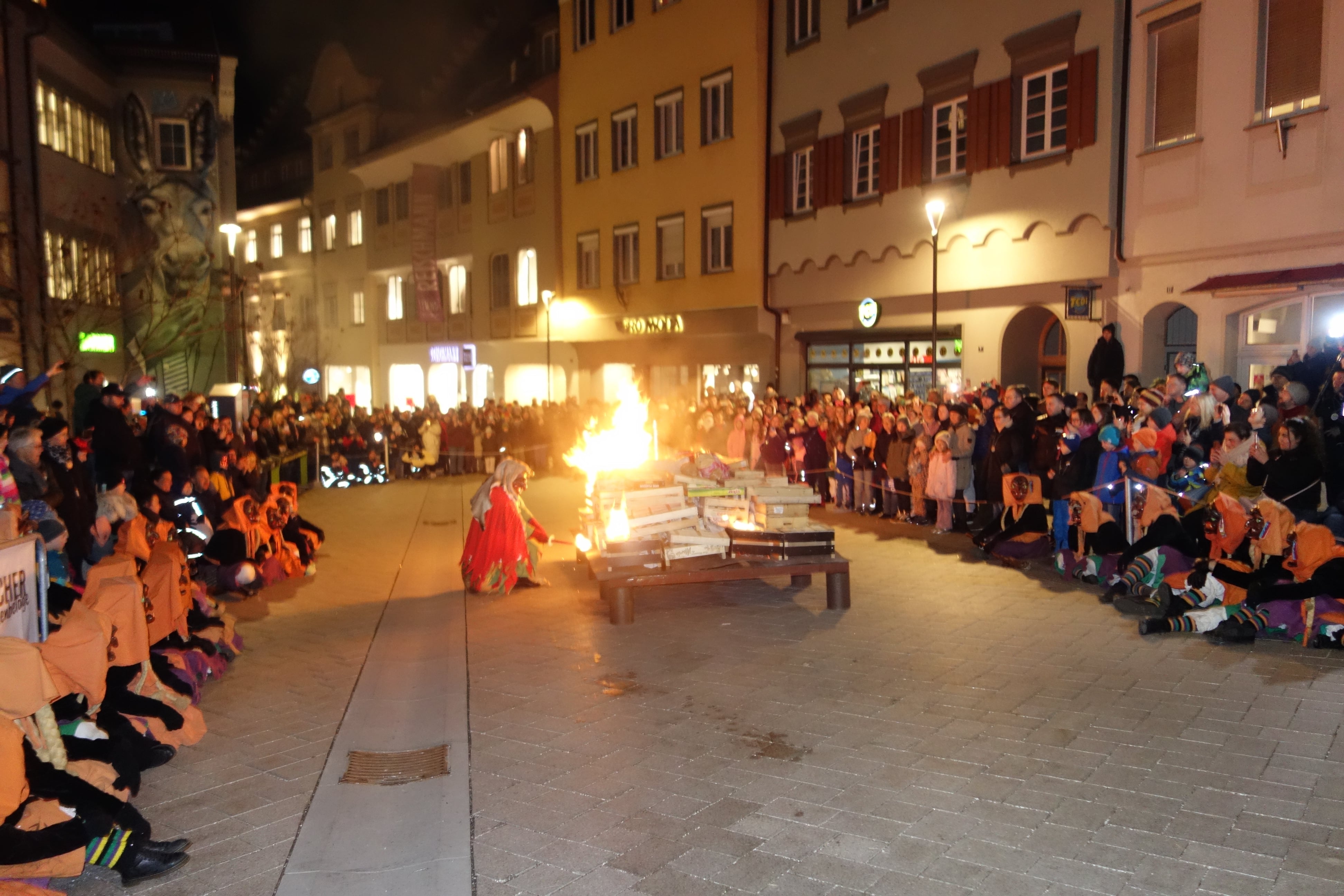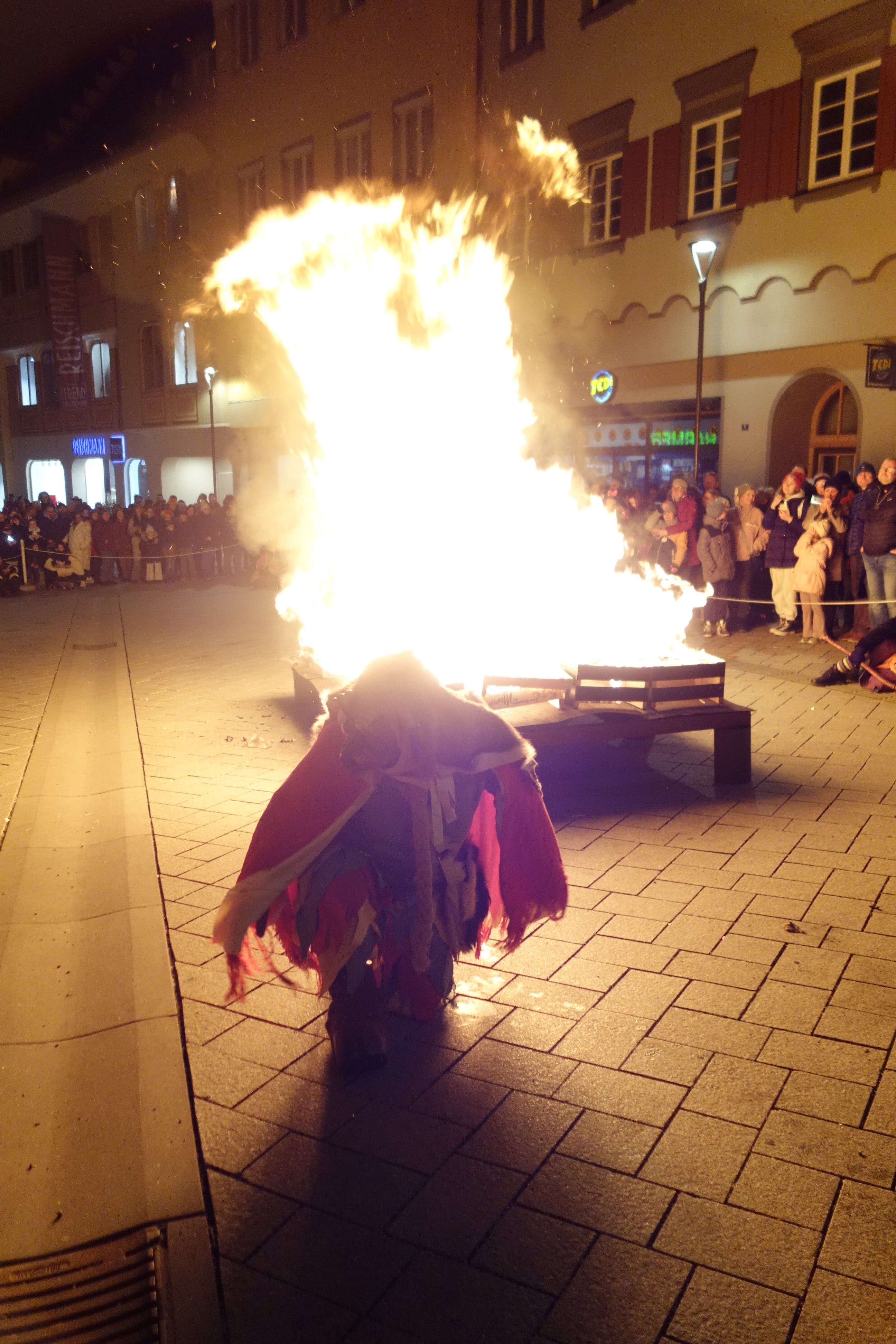 Zu Glockenschlägen bahnte sich der Hexenteufel mit einer Fackel den Weg hin zur Richtstätte, wo bereits die alte Fasnet auf ihrem letzten Ruhebett aus Holz ruhte. Die Flammen züngelten sich durch das aufgeschichtete Holz und so erhellte alsbald ein greller Lichterschein des Scheiterhaufens den nächtlichen Gespinstmarkt.