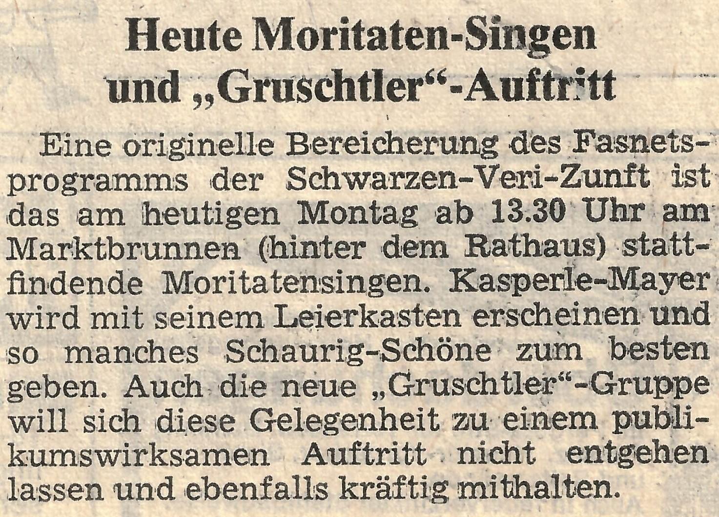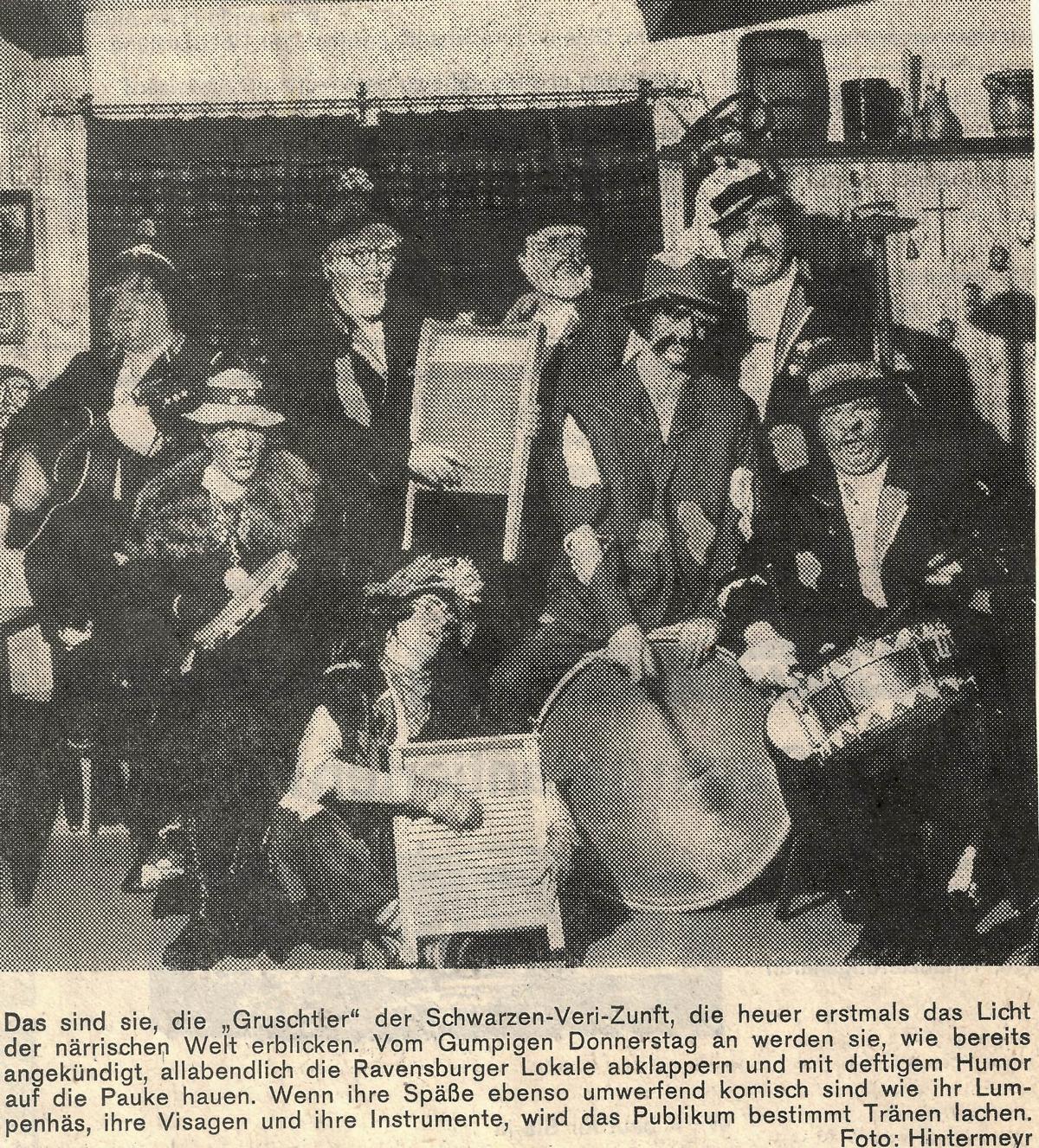 Die "Gruschtler" der Ravensburger Schwarze Veri Zunft e.V. erblickten am Gumpigen Donnerstag 1976 das Licht der Welt. Mit ihren unverwechselbaren Lumpenhäsern unterhielten sie unsere Mitglieder und tingelten durch unser Städtle - sehr zur (Schaden)Freude ihrer Zuhörer. Auch begleiten sie unser Ravensburger Original, den "Kasperle Mayer" bei seinem Moritatengesang.