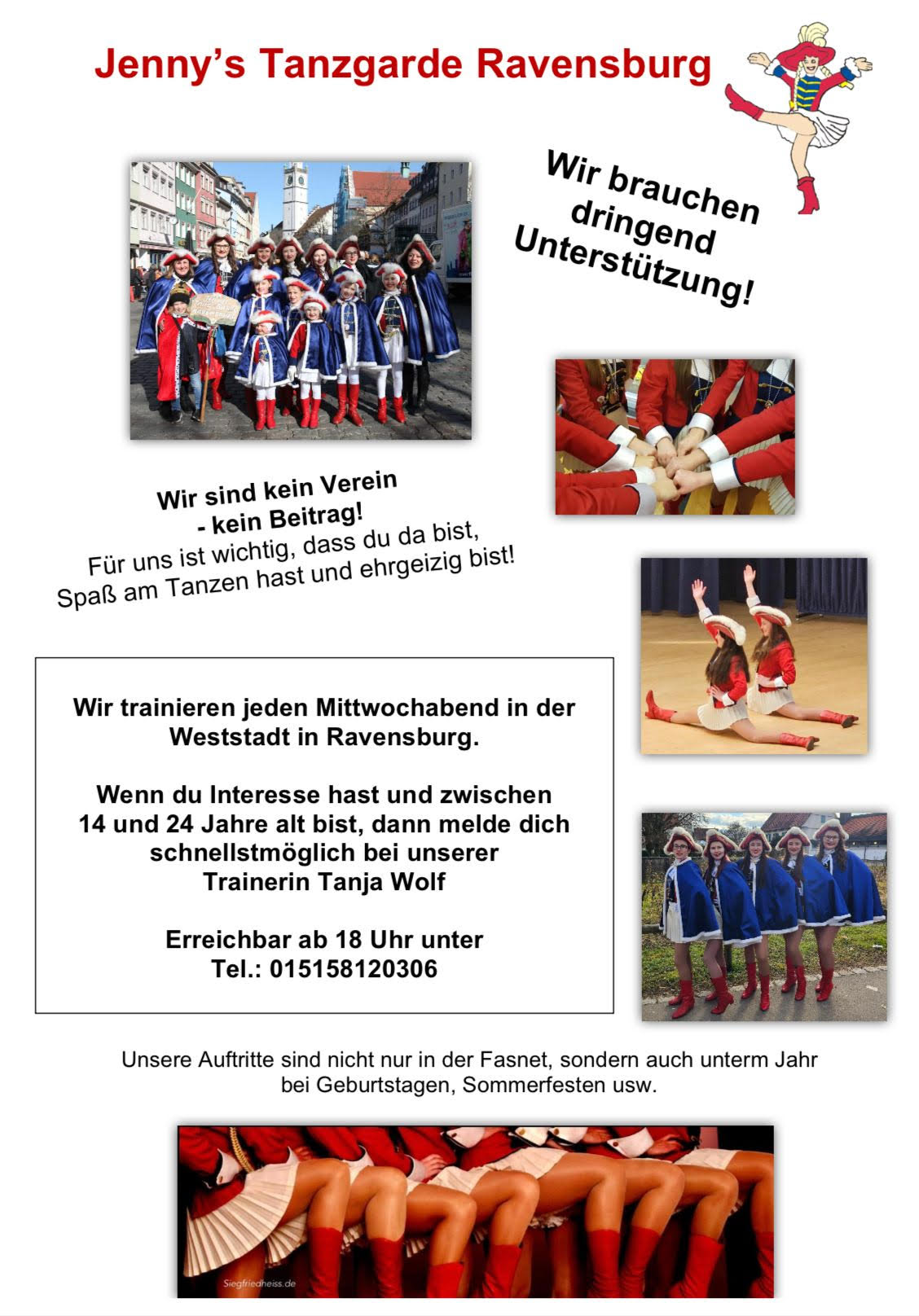 Bitte unterstützt Tanja und ihre Jenny´s Tanzgarde, damit diese wunderbare und wunderschöne Tradition des Gardetanzes auch bei uns in Ravensburg eine Zukunft mit vielen vielen Aktiven hat.