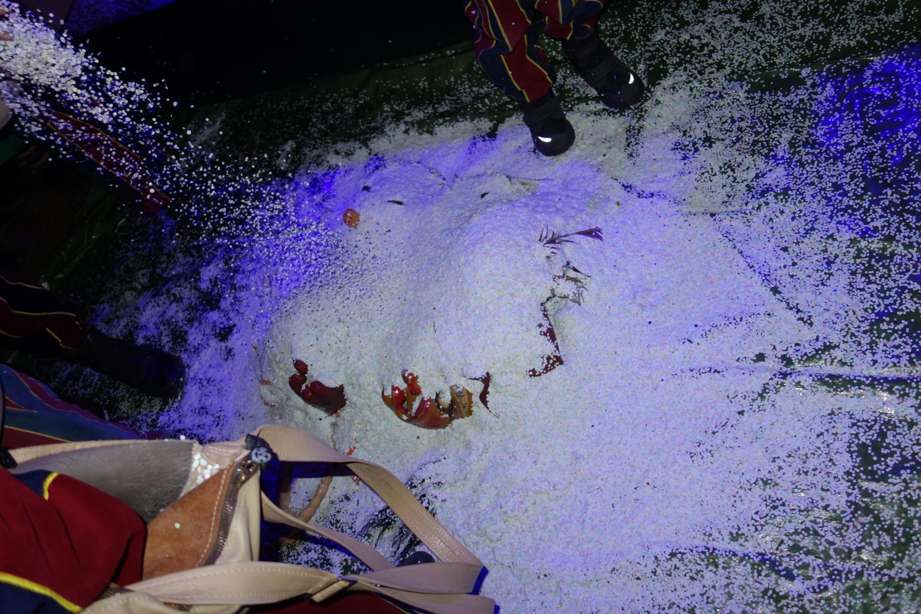 Leider betrat zu vorgeschrittener Stunde ein Mönchen im Henkersgewand mit einer Sichel bewaffnet die Bühne. Zu biblisch vorgetragenen Texten hauchte er unseren Masken das Leben aus. Zur letzten Ruhe für die Fasnet 2023 gebettet, kondolierten die Anwesenden mit Konfetti.