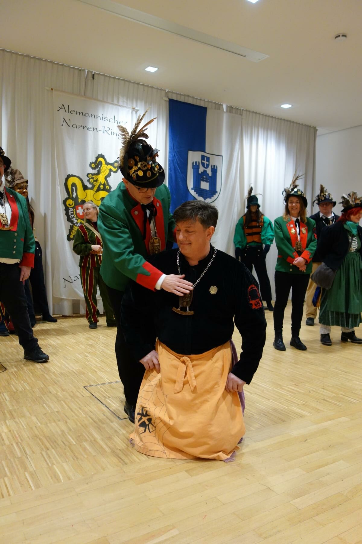 Im Anschluss schwang Maskenmeister Markus Kraus gekonnt und geübt seinen Staubwedel. Auch wenn der eine oder andere Schlüssel noch nicht so recht seinen Weg in die Schranktüre finden wollte ... es gelang nach kurzem Verweilen und hantieren am und mit dem Schlüsselbund. Ein sehr schläfriger Hexenteufel wurde sanft von der Federstrichen des Staubwedels wiederbelebt. Nach einigem Recken und Strecken zeigte sich der Hexenteufel aber schon nach kurzer Zeit wieder putzmunter. Und so bahnte sich ein/eine Neunarr/-närrin der Zunft nach der/dem anderen ihren/seinen Weg durch den Kasten (also Schrank). Nach dem Entstauben der Masken und Häser erhielten die Neumitglieder ihren Erstlingsorden.