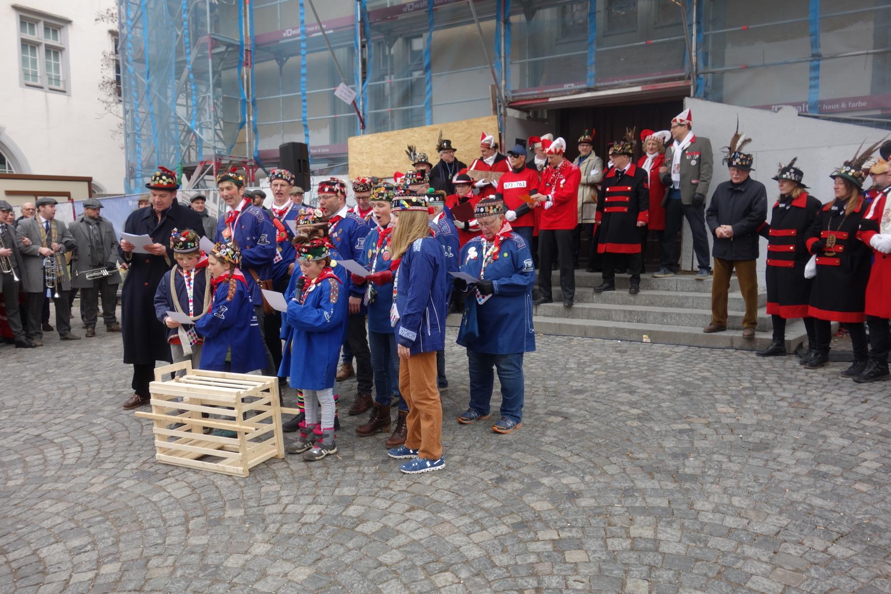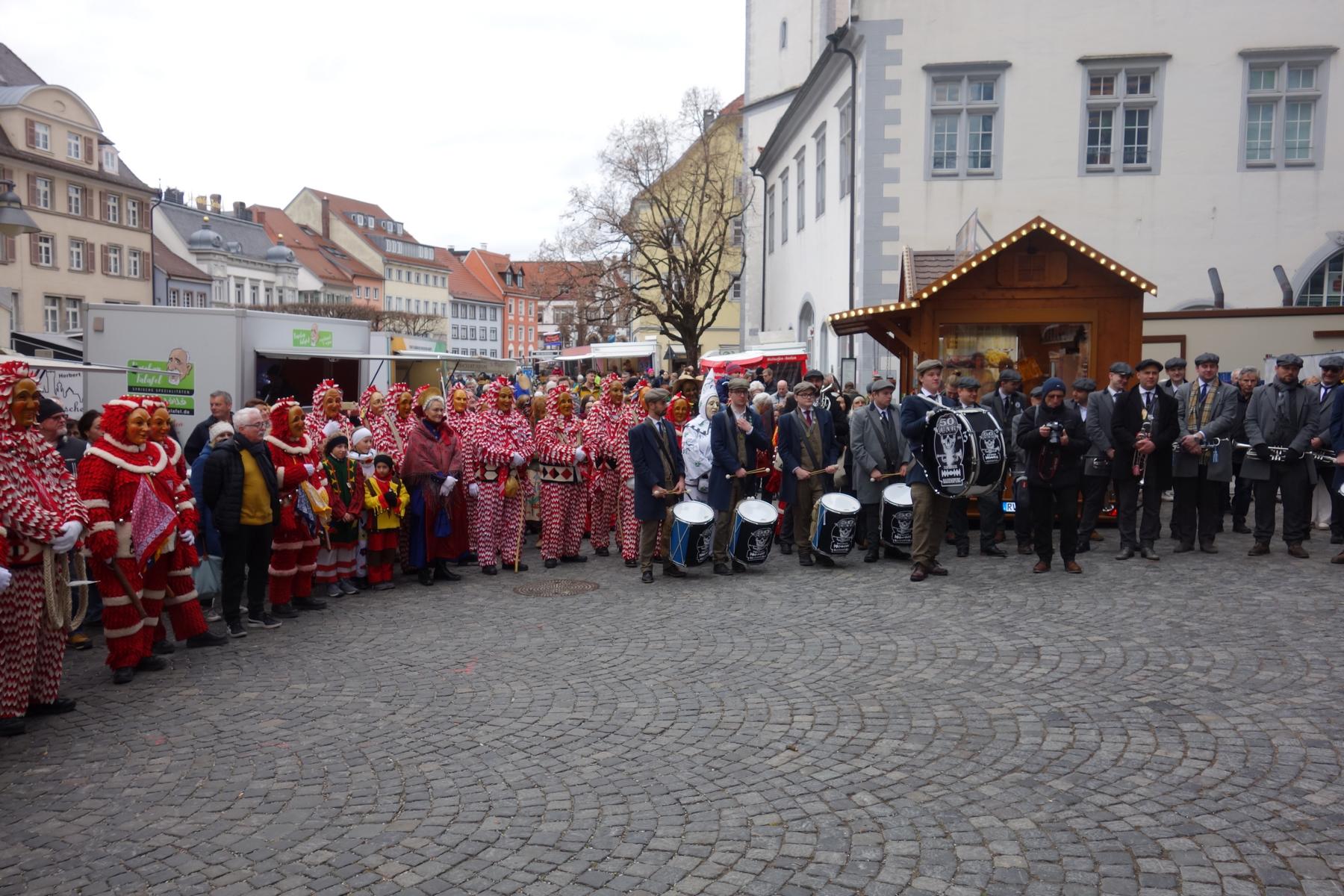Das tat der schwester- und brüderlichen Stimmung der Anwesenden allerdings keinen Abbruch. Gemeinsam wurde zu den Tönen des Mostclubs "L", dem Fanfarenzug Rauenspurg der Stadt Ravensburg e.V. und den Schwarze Veri Schalmeien eingehakt, geschunkelt und gesungen.