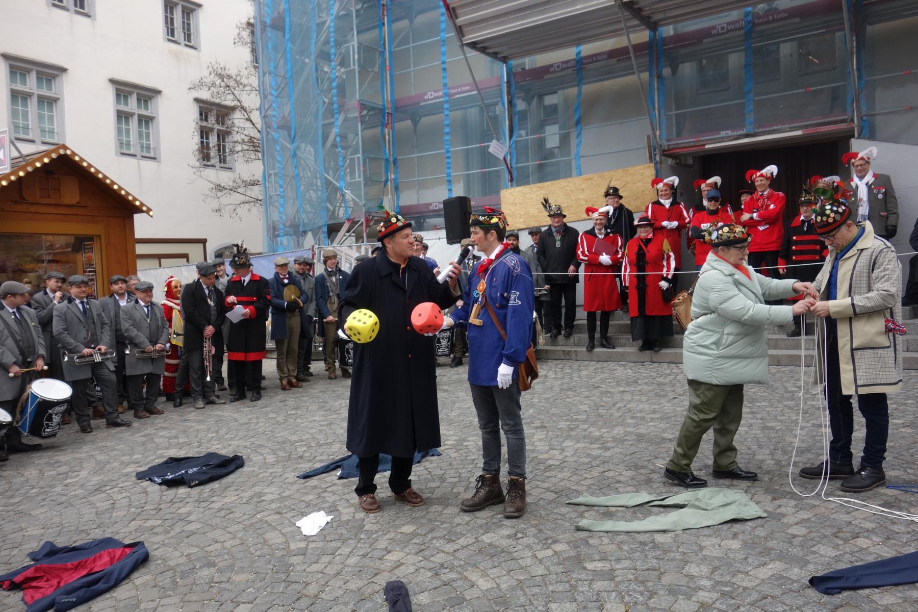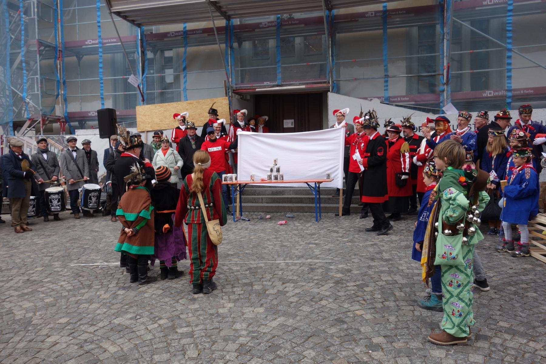 Die Plätzlerzunft Altdorf-Weingarten 1348 e.V., der Mostclub "L", die Milka und die Ravensburger Schwarze Veri Zunft e.V. reichten sich am Ravensburger Rathaus die Hand.