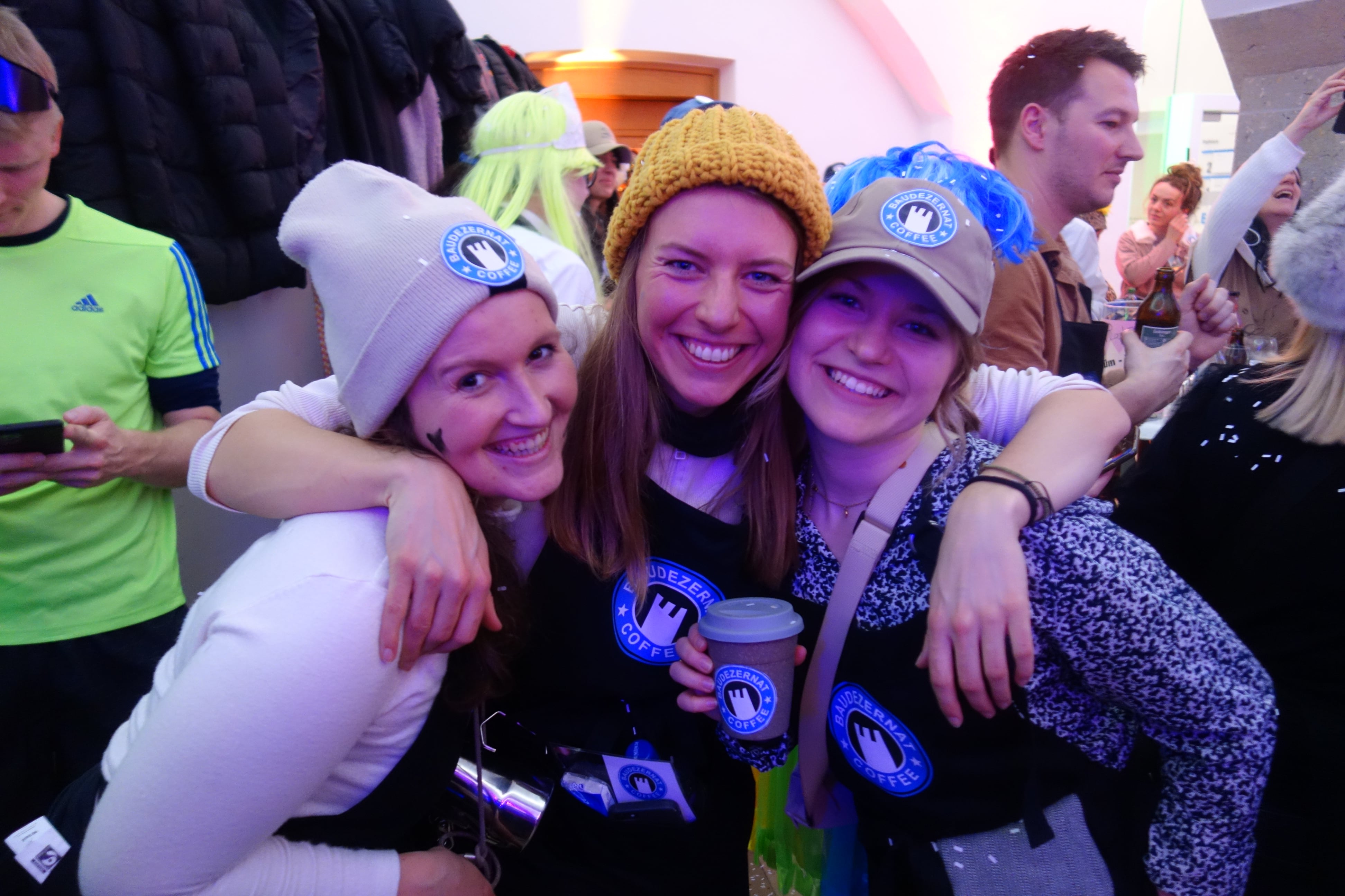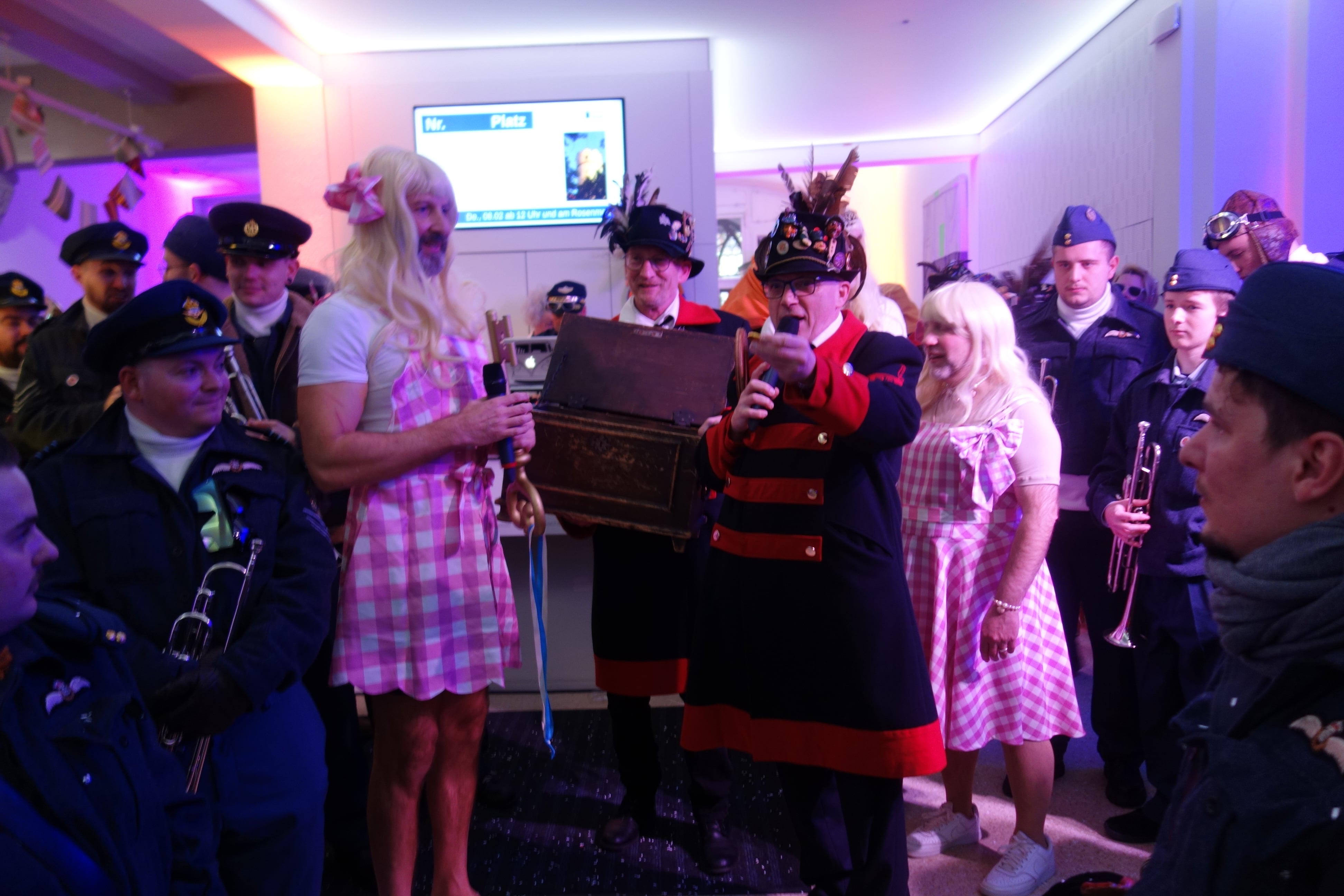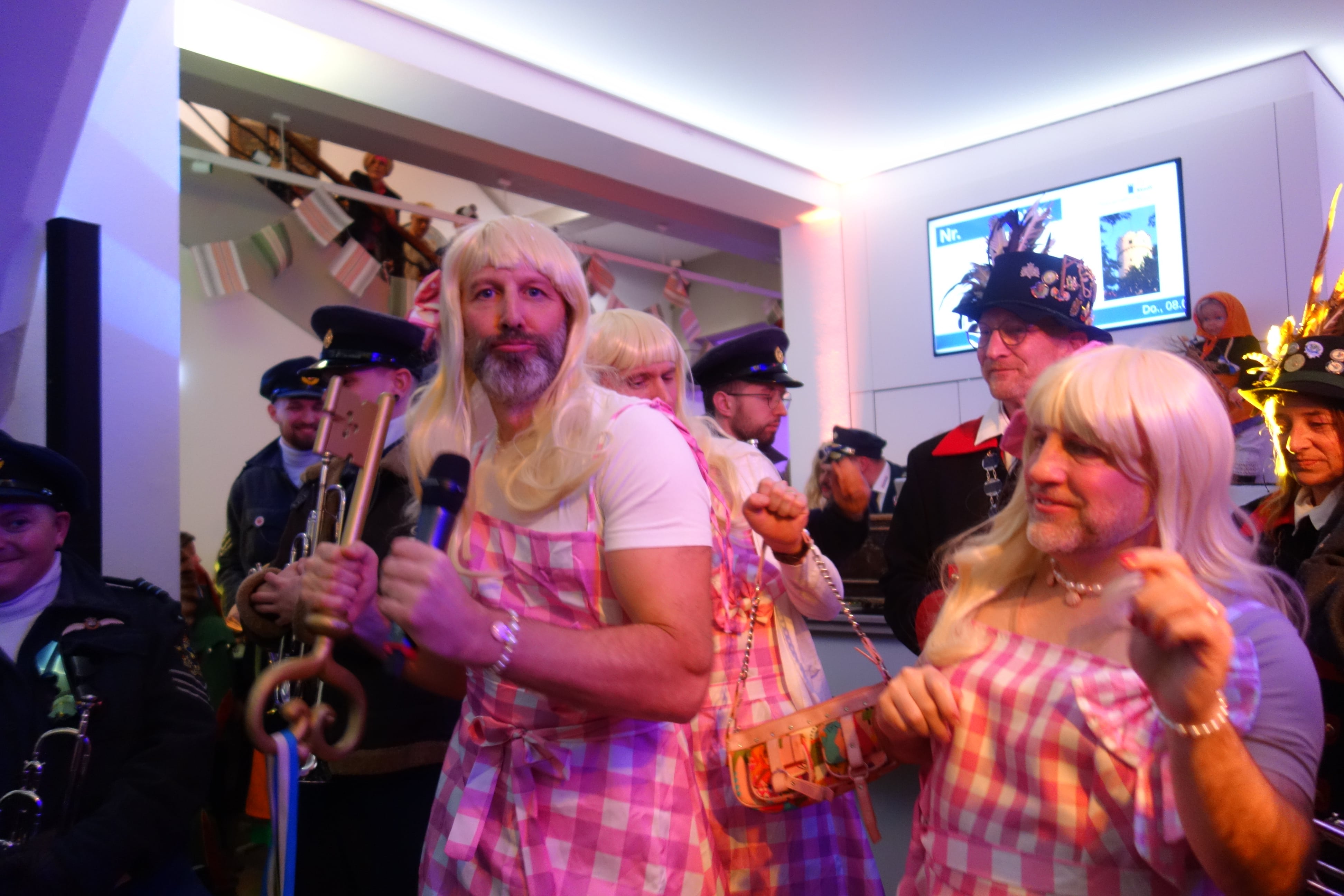 Das ist/war schon ein Bild, wenn man als Zunft von so drei wüsten Grazien im Barbie-Look empfangen wird ... Soooo sieht die Ravensburger Bevölkerung unseren OB Dr. Daniel Rapp, den 1. Bürgermeister Simon Blümcke und Baubürgermeister Dirk Bastin wohl eher selten! Ein fürwahr imposanter und auch etwas erschreckender Anblick - aber wir haben ja schließlich Fasnet und unsere Stadtoberen sind abgesetzt.Ja ja - die drei Damen vom Rathaus.