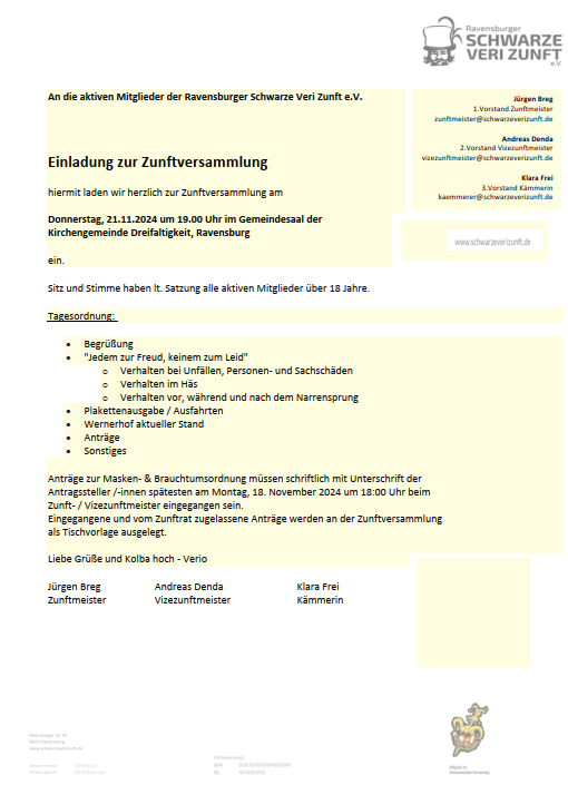 An alle aktiven Mitglieder der Ravensburger Schwarze Veri Zunft e.V.