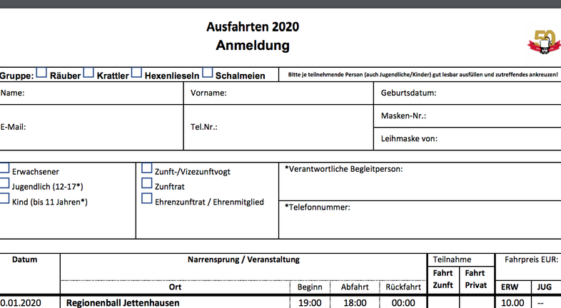 Pünktlich zur Zunftversammlung stellen wir euch unsere Ausfahrtenliste für 2020 zur Verfügung.